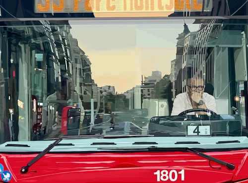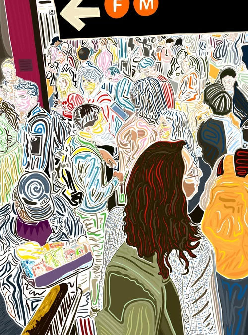 French Bulldog in bag and Woman Commuting on Subway, New York